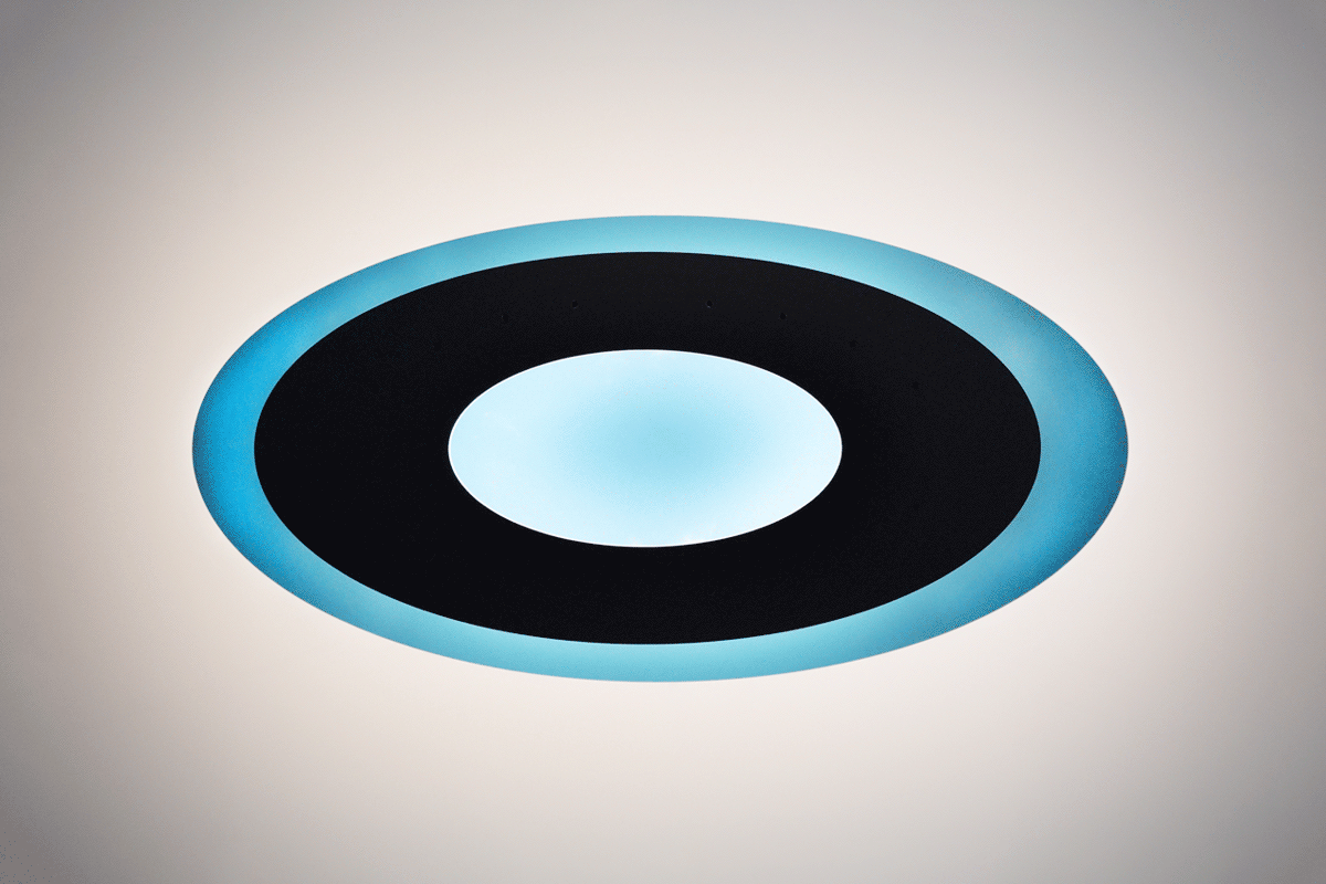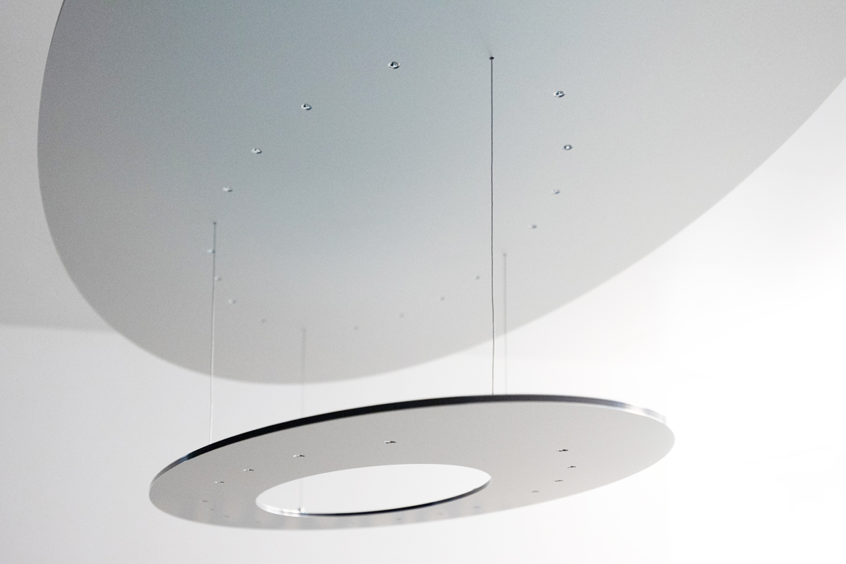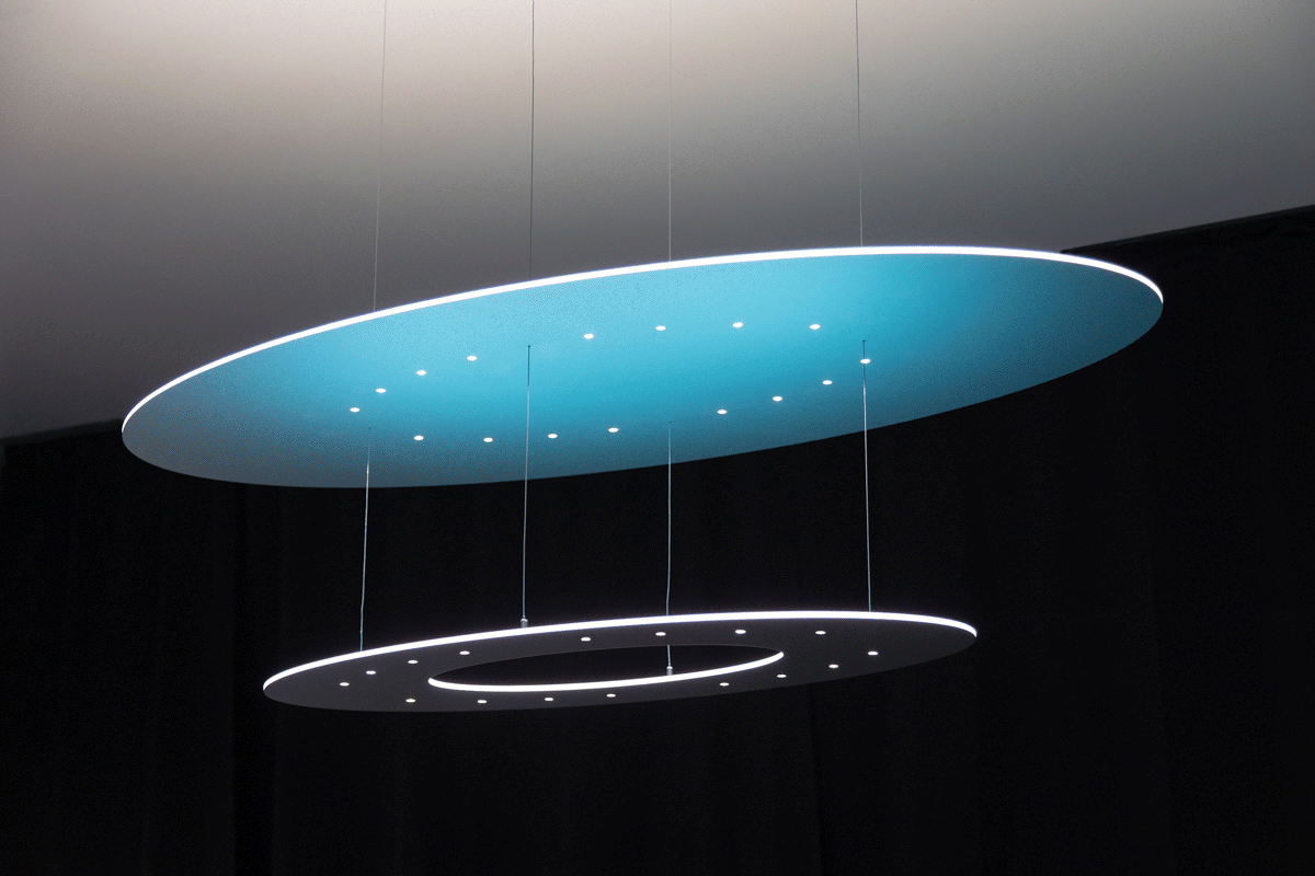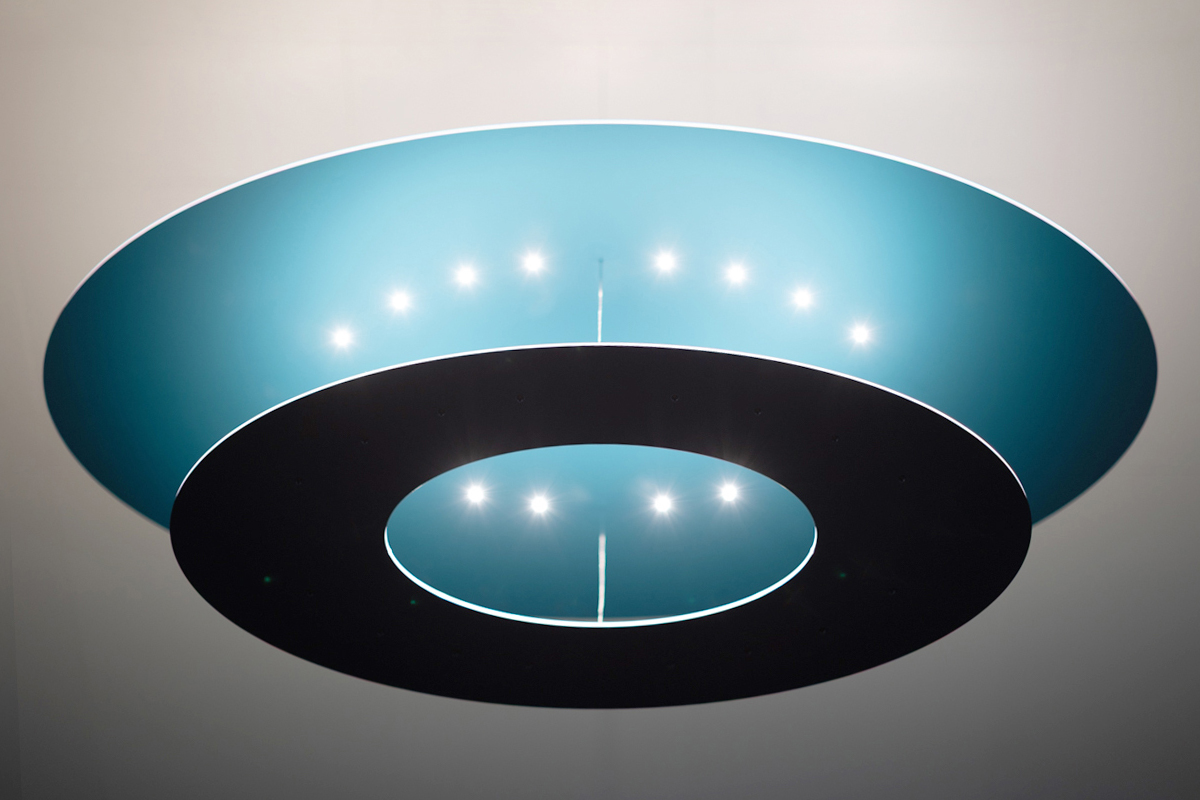 A unique elliptical SparkShape luminaire, made of silver material – yet it appears blue. Only targeted reflection transforms its surface and creates an appealing blue. The appearance of the luminaire changes in a matter of seconds.